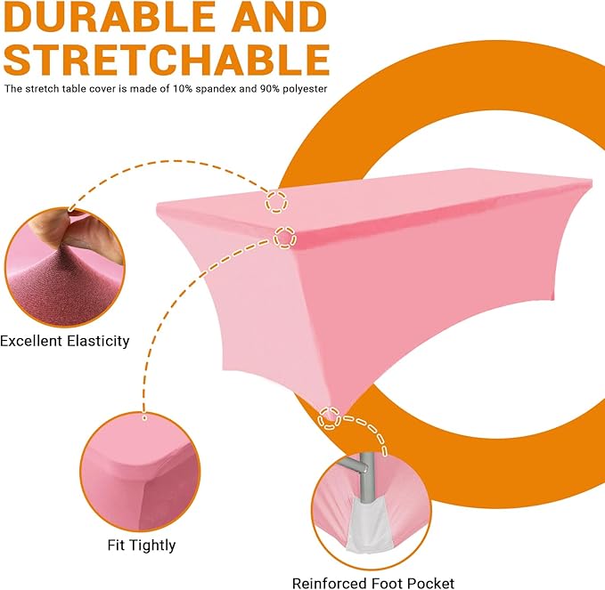 - DURABLE & SPANDEX: The stretch spandex rectangular table cover was made from 10% Spandex, 90% Polyester material, wrinkle and stain resistant stretch spandex fabric with a 200 GSM, which make tablecloth more stretchable and durable, does not require ironing and can be laundered countless times.