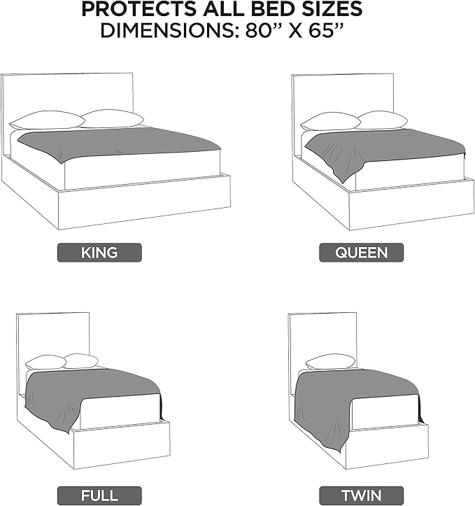 - CONVENIENT 80” x 65" SIZE: Use as a waterproof pad for couch, or simply place on top of any bed, even Queen or King, where the spills and stains happen. Enjoy peace of mind knowing your comforter, duvet cover, bedspread, throw, mattress, couch, sofa, or sectional, will stay dry and clean.