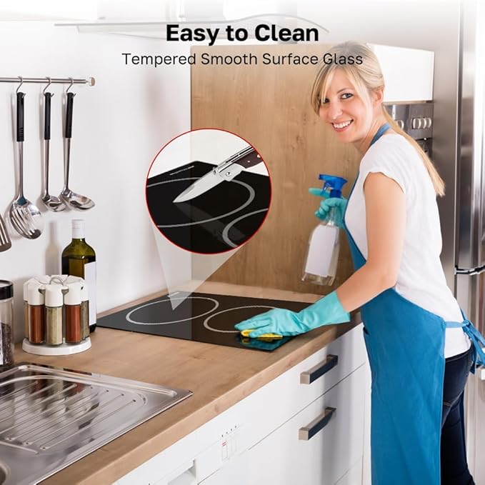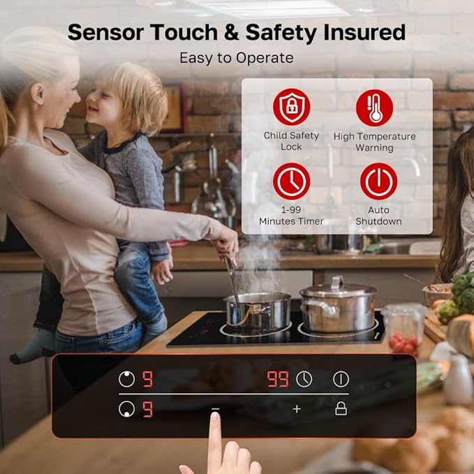 - 9 Level Sensor Touch Control: The drop-in electric cooktop has 9 power levels for precise heating. This ceramic cooktop can heat from low heat to a rapid boil, and switch between stewing, frying, sautéing, roasting and more with one touch. Sensor touch control is easy to use for all family members, making cooking enjoyable.
