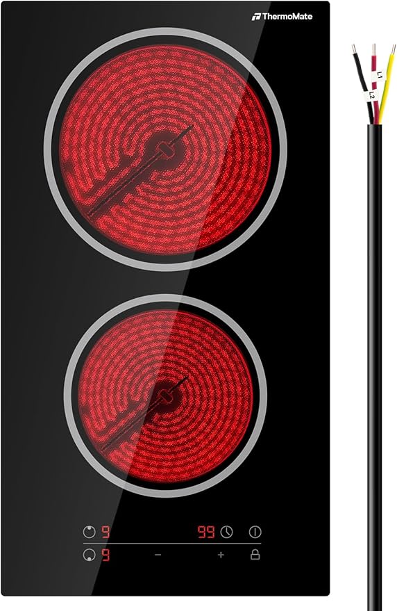 ThermoMate 2 Burners Electric Cooktop, 12 Inch Built in Electric Radiant Stove Top, 3200W Ceramic Glass Cooktop with Sensor Touch Control, 9 Heating Level, Chlid Lock & Timer, 220-240V Hard Wire
