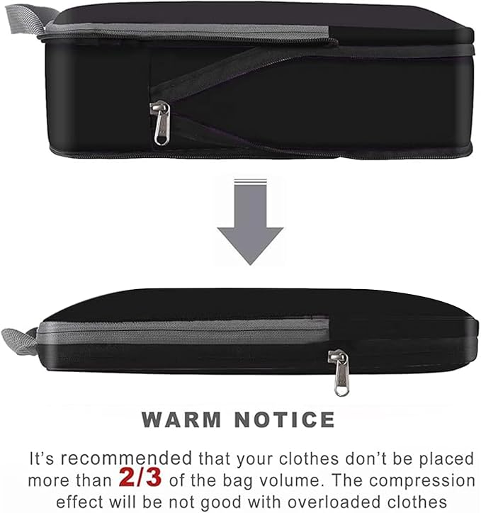 - HOW TO MAKE THE COMPRESSION HAPPEN? - There Is a Extra Zipper Outside Of Our Compression Packing Cubes Which Can Be Zipped Up To Flatten The Cubes And Save The Space As Far As Possible. It Just Works Like a Vacuum Sealer. You Just Need To :1) Fold Your Clothes And Flatten Them 2)Pack Clothes In The Cubes And Zip The Normal Zipper. 3)Put A Finger On The Back Of The Zipper In The Space When Compressing The Packing Cubes In Case The Zipper Get Stuck In Fabric.