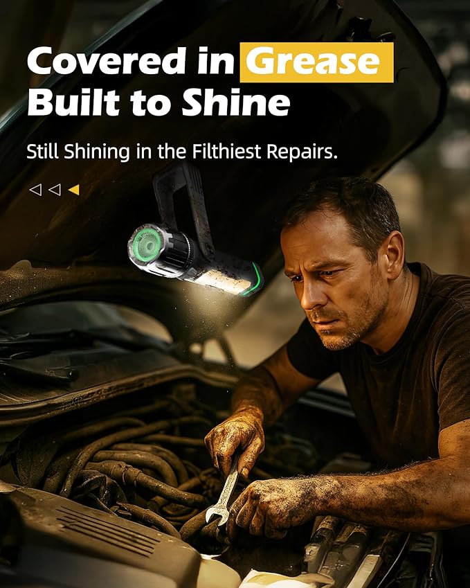 - 【Magnetic LED Worklight with 240° Rotating Bracket】The bracket rotates 240°, letting you direct the beam exactly where it’s needed. Perfect for hands-free lighting during engine inspections, garage projects, or when working in confined spaces. The sturdy support bracket features a built-in magnet at its base, allowing you to securely attach the work light to any metal surface—like a car hood or tool cabinet.