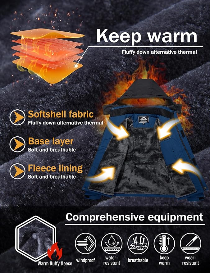 • Water repellent: Professional water repellent jacket, keep your body always dry and comfortable, you won't worry about getting wet while skiing, snowboarding, hunting, hiking in inclement weather.