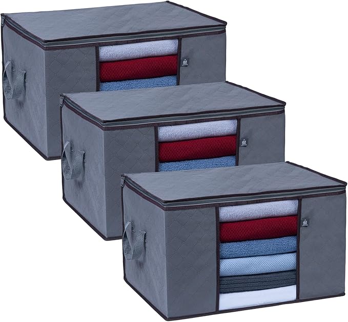 VENO 3 Pack Extra Large Clothes Storage Bag Organizer with Reinforced Handle Thick Fabric for Comforters, Blankets, Bedding, Foldable with Sturdy Zipper, Clear Window, Grey, Reusable (24 Gallon)