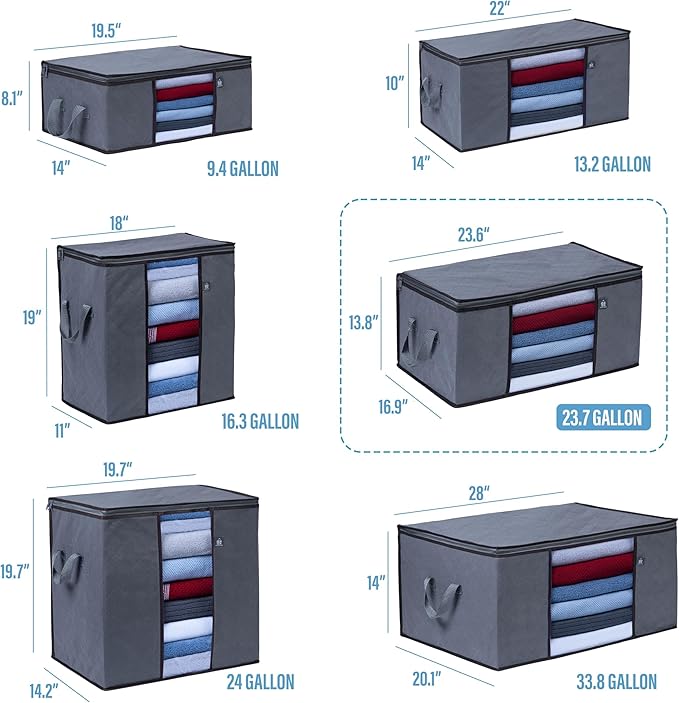 - EXTRA-LARGE SIZE: 23.5” W x 14” H x 17” D. 24 Gallons or 90 Liters of storage capacity. Large capacity to fit various items such as clothes, towels, linens, sheets, blankets, throws, quilts, comforters, bedding, pillows, curtains, shoes, etc. Multifunctional and ideal for storing seasonal clothing, transporting your bedding during moves, organizing your belongings, and freeing up closet and drawer space. Conveniently stack under your closet rack or store on top of your closet rack.