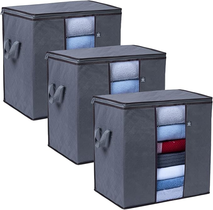 VENO 3 Pack Clothes Storage Bag Organizer with Reinforced Handle Thick Fabric for Comforters, Blankets, Bedding, Foldable with Sturdy Zipper, Clear Window, Reusable (Tall 24 Gallon)