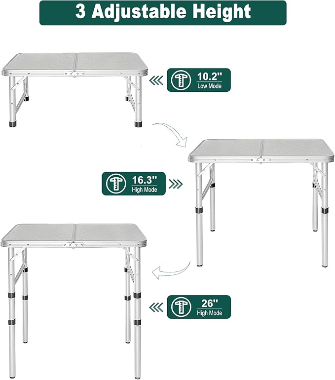 - 3 Adjustable Heights: This 2ft folding table is 24"x16", height is 10" in low, 19'' and 26" in high. Pack size is 16"x12"x3" when folded in half.
