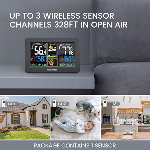 - [3-channel Home Weather Stations Wireless Indoor Outdoor] Wireless temperature forecast station supports up to 3 remote sensors to monitor inside outside temperature & humidity of multiple locations. Package contains one remote sensor.