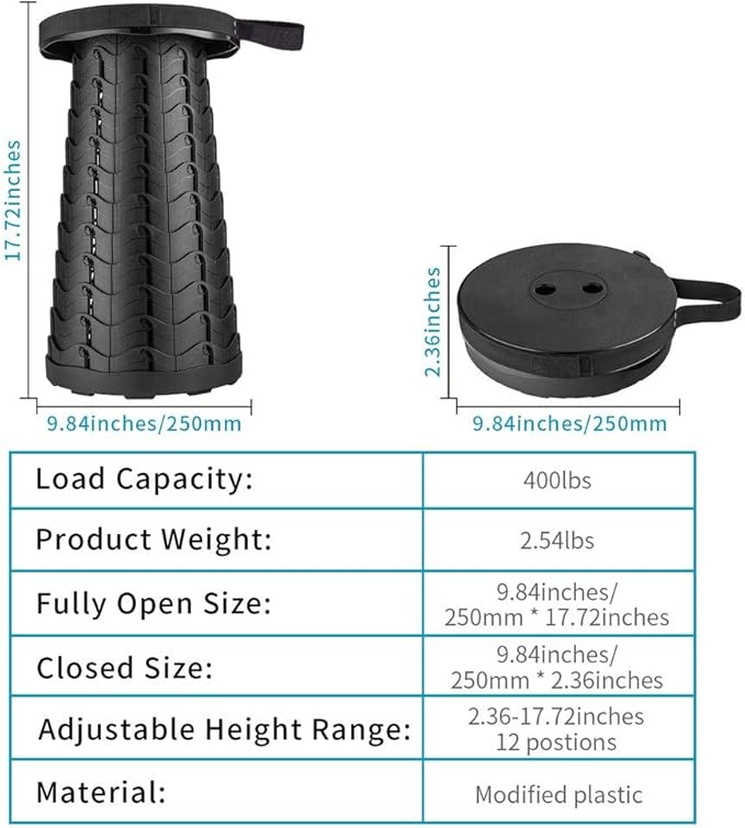 - PORTABLE & LIGHTWEIGHT: This telescopic stool is only 2.54 pounds with dimeter 9.84 inches/250mm. The adjustable strap makes the stool easy to carry in your hand or hanging on your shoulder. Perfect to use for camping, fishing, hiking, hunting, picnic, BBQ. Also can be used in living room, bedroom, bathroom etc