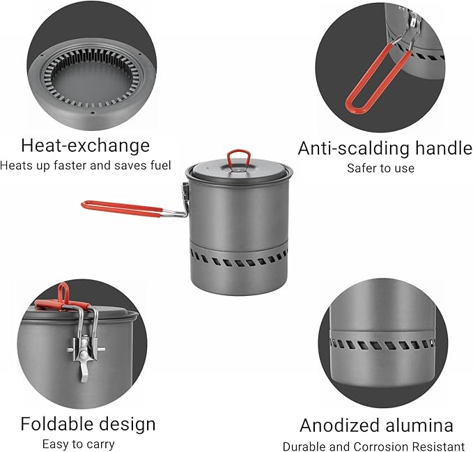 - HIGH-EFFICIENCY HEAT EXCHANGE DESIGN - The bottom of the BULIN camping pot features a specially designed heat exchange ring that captures and maximizes heat, allowing you to boil water 30% faster than standard cookware. This efficient design helps conserve fuel and ensures quick boiling, even in windy conditions.