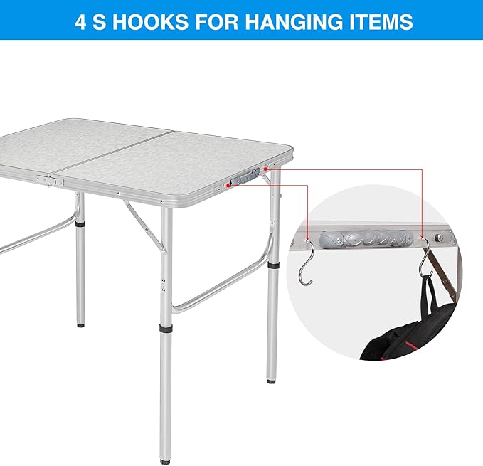 - Easy to Set Up & Waterproof: Install the folding camp table within a few seconds. Folds flat for easy storage. Easy to clean the tabletop with cloth or paper