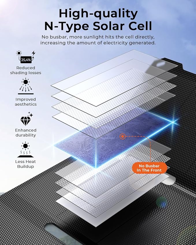 - Premium-grade Solar Cell: Without metal lines on the front, the solar cells BigBlue used capture more sunlight, increasing electricity generation while providing a sleek, modern design. Fewer front-side components also help these cells stay cooler, enabling solar panels to maintain a power conversion efficiency of up to 25.4%