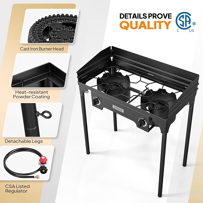 - POWERFUL COOKING BUDDY ★ With durable material & 150,000-BTU high output burners to work with, this burner stove makes camp cooking easily and works well for outside; Perfect for outdoor parties cooking, brewing, camping, fishing, etc.