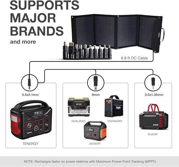 - 60W Solar panel - Harvest the sun and store the energy in portable power stations while outdoor or during an energy emergency. Compatible with portable battery packs from the following brands: Suaoki, Goal Zero Yeti, Webetop, Paxcess, ROCKPALS. NOTE: Portable power stations must have maximum power point tracking charge controller in order to fully utilize all the power generated by Tenergy's solar panel.