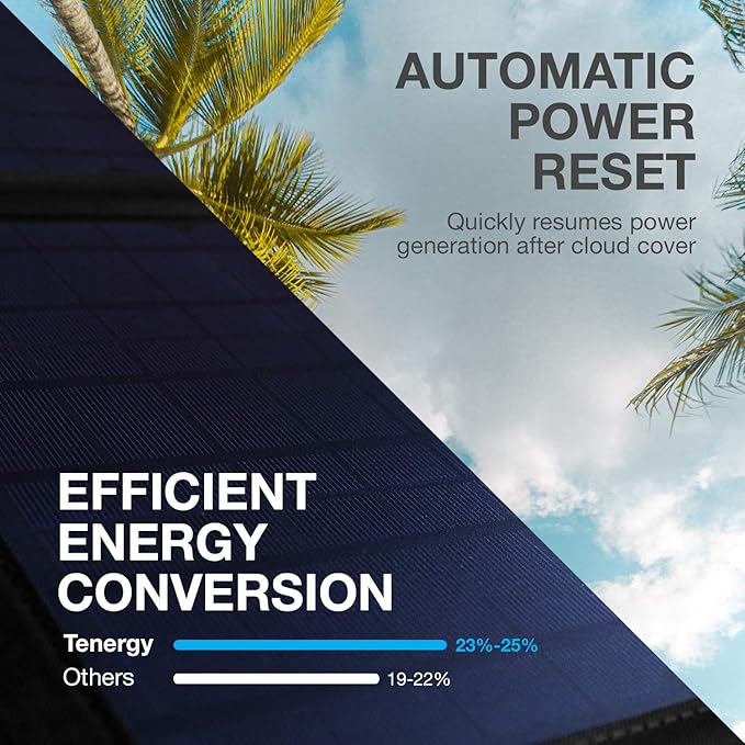 - Maximize power generation - Even on cloudy days Tenergy's solar panel will generate more power than regular solar panels thanks to the power reset chip. Use the kickstands to angle the panels towards the sun throughout the day to gather more power.