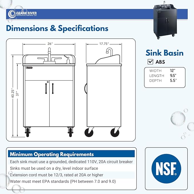 - NSF-Certified – Stay handwashing code-compliant with this NSF-certified, portable sink with hot water. Get food and medical-safety grade handwashing anywhere you need it. Simply plug in this self contained sink and say goodbye to code compliance questions and costs