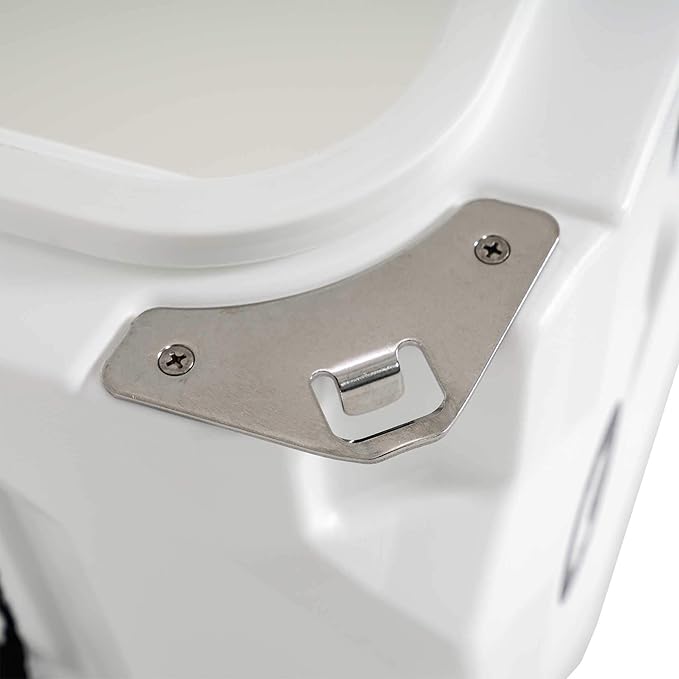 - ADDITIONAL FEATURES: (2) rope handles with storm gray injection molded grips, (4) feet that are serviceable, (2) bottle openers, (2) holes for locks (locks not included), (2) latches that secure lid