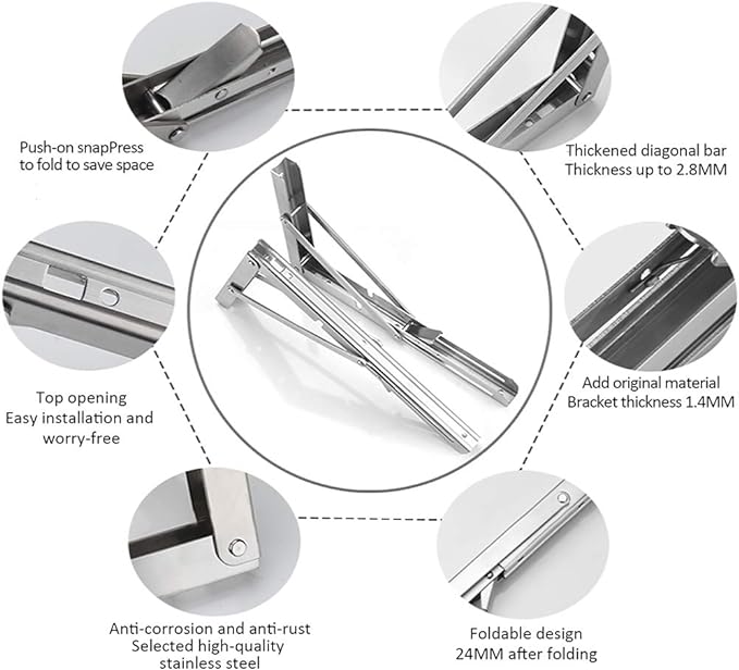 - Space Saving:Our folding brackets help maximize space by mounting them on walls in your garage, kitchen, shop, workshop, boat, motorhome, backyard, trailer, balcony, bathroom, and more. Perfect for creating more room in various areas