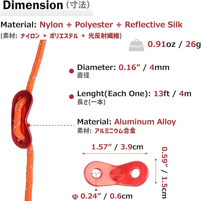 - π SIZE: The diameter of the rope is about 4 mm, the length is 4 m, weight is 140g. Each tent rope has an cord tensioner, which can adjust the length of the rope freely