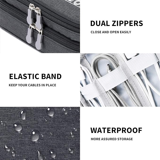 - WATERPROOF & PROTECTED - This cable case is made of water resistant polyester material. With the padded foam around to protect all the things inside the bag, the fabric is easy to clean, 2 way zippers make it easier to open and close the bag to take your charger cable or any other electronic accessories in a short time