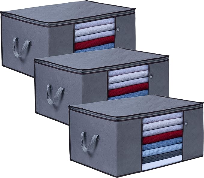VENO 3 Pack Oversize Clothes Storage Bag Organizer with Reinforced Handle Thick Fabric for Comforters, Blankets, Bedding, Foldable with Sturdy Zipper, Clear Window, Grey, Reusable (34 Gallon)