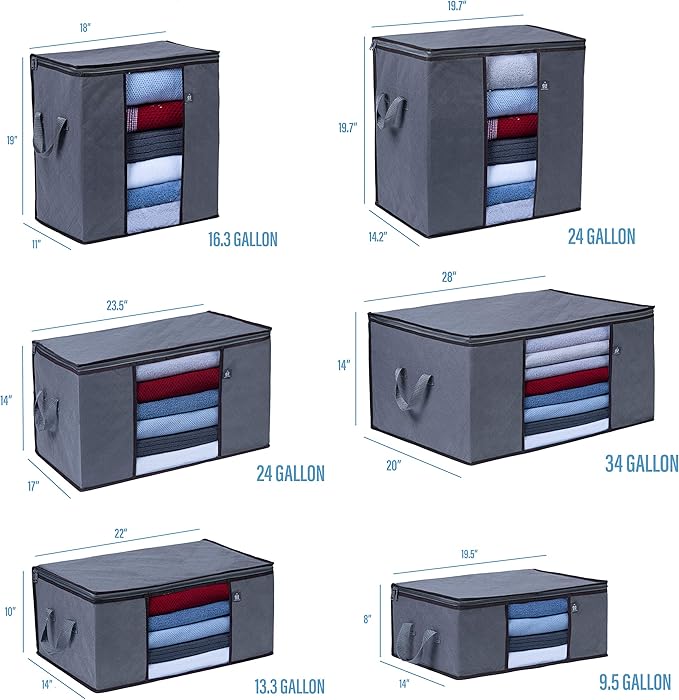 - OVERSIZE: 28” W x 14” H x 20” D. 34 Gallons or 129 Liters of storage capacity. Large capacity and spacious enough to fit various items such as clothes, towels, linens, sheets, blankets, throws, quilts, comforters, bedding, pillows, curtains, shoes, etc. Multifunctional and ideal for storing seasonal clothing, transporting your bedding or towels during moves, organizing your belongings, and freeing up extra closet and drawer space. Conveniently stack and store under your closet rack.
