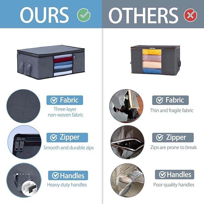 - REINFORCED HANDLES: Thick, strong, reinforced handles are designed for convenient access and portability without breaking or tearing. Handles are sewn with 6 layers of quality, sturdy fabric to double the load capacity. Cross-stitched seams are added for maximum strength and security.