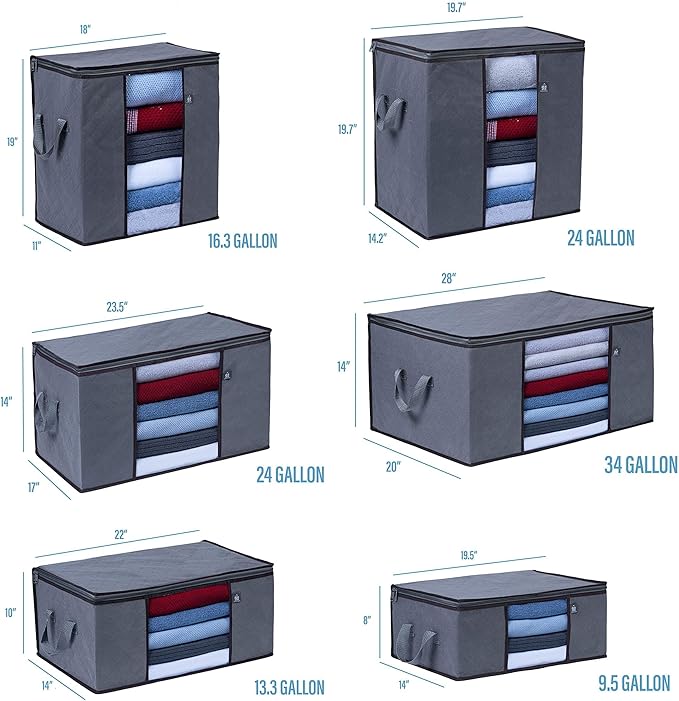 - MEDIUM SIZE: 19.5” W x 8” H x 14” D. 9.5 Gallons or 36 Liters of storage capacity. Large capacity and spacious enough to fit various items such as clothes, towels, linens, sheets, blankets, shoes, etc. Multifunctional and ideal for storing seasonal clothing, transporting your blankets or towels during moves, organizing all your belongings, and freeing up extra closet and drawer space. Conveniently store in narrow closet or drawer space, on top of your closet rack, or under your bed.