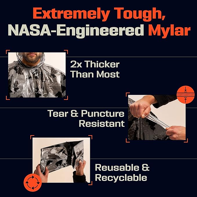 - Lightweight & Durable – Double the thickness of standard emergency blankets, this NASA-engineered survival poncho resists tearing from branches or rough surfaces, ensuring it withstands rugged use for added peace of mind.