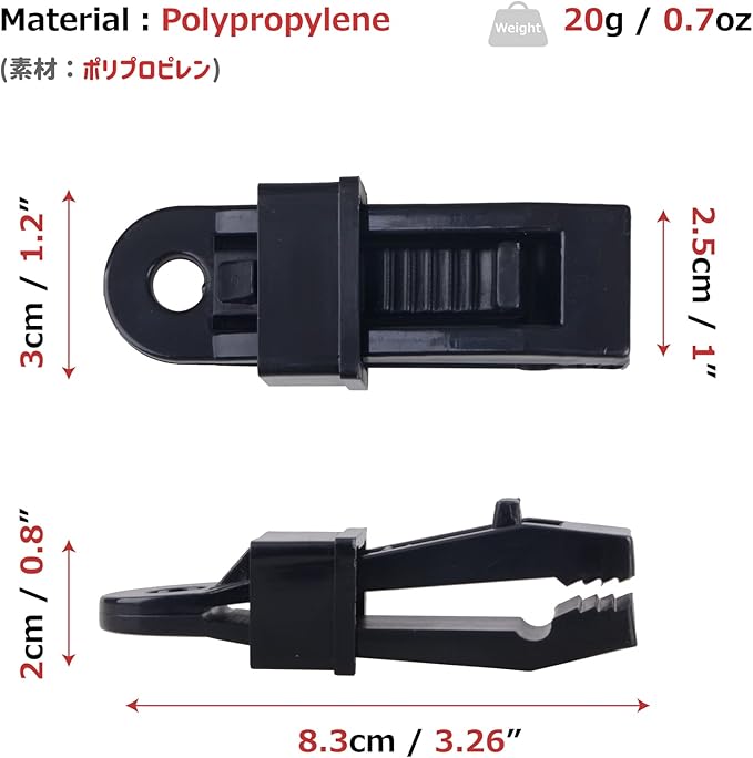 - ☘️ MATERIAL: Guide rope: Polypropylene + reflective silk; cord adjuster / carabiner: aluminum alloy; tarp clip: PP