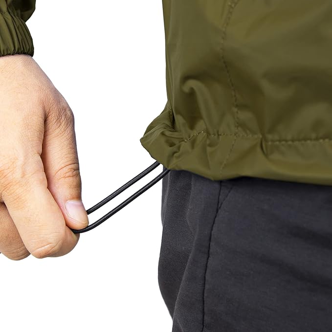 • ?�Unique Design?‘Lightweight lite rain jacket elastic cuffs prevent the rain drops to the cuffs; Adjustable drawcord hood to prevent yourself from being wet; The hem contains elastic rope for warmth and keep you dry. Suitable for casual wear, outdoor sports, outdoor work, traveling, cycling, hiking, climbing, fishing, camping, hunting.