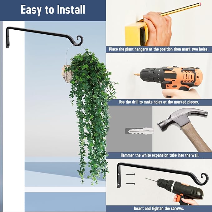 - ?�EXCELLENT QUALITY?‘:The decorative plant hanging bracket is 4 inches in height and 12 inches from the wall, the screw length is 1.6 inches, making it suitable for hanging your favorite indoor and outdoor decorations. These hanging plant hooks are made of high-quality iron and coated with powder,they are rust and corrosion resistant. Premium quality makes them sturdy.
