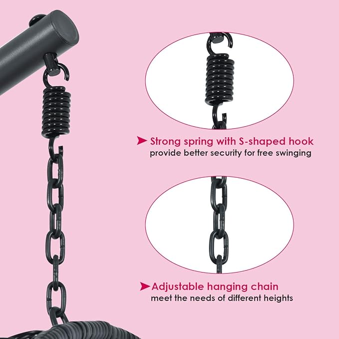 - Great Balance & Enjoy Leisure Time: Safety hook, durable hanging chain and strengthened frame ensure the great balance. Besides, the chair is secured with a strap for safety. You can spend joyful swinging time with its powerful function. Enjoy the panoramic day sitting in the chair.