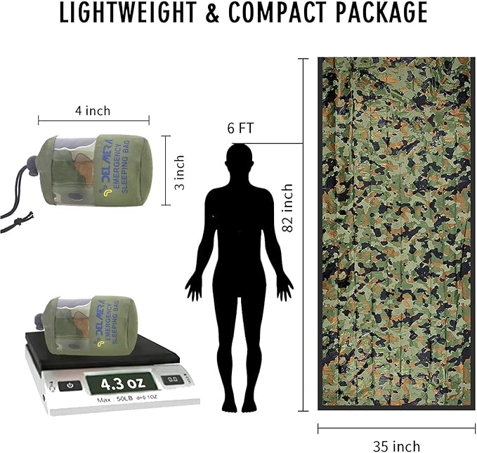 - ULTRA LIGHTWEIGHT & COMPACT SLEEPING BAG—Dimension: 3.08 ft x 6.73 ft(37*80.7 inches), enough to accommodate an adult; Lightweight at 4.6 oz, it's easy to carry. Small enough to fit in the palm of your hand, Delmera’s Bivy survival sleeping bag comes rolled up inside handy nylon stuff drawstring bag sack so you can store it nearly anywhere. First aid sleeping bag is guaranteed, not easy to tear, good waterproof performance, strong wind resistance, strong insulation performance