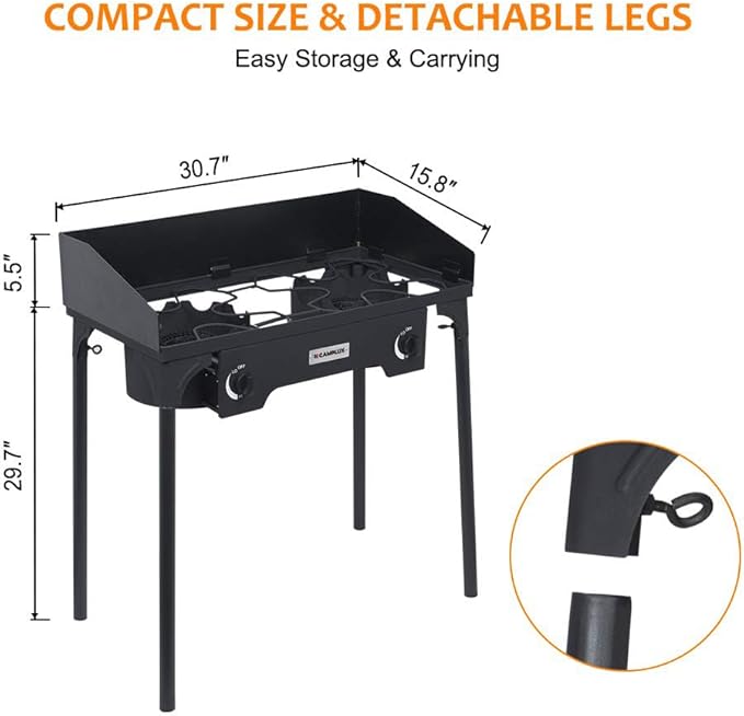 - Multifunctional Outdoor Propane Burner - With detachable legs and 3 foldable and detachable wind deflectors, it is easy to carry. Very suitable for outdoor use. Such as hunting shutters, deer racks, camping, RV, fishing, hunting camps, tailgates, terraces, sporting events, beaches, beer brewing, canning, and clam baking