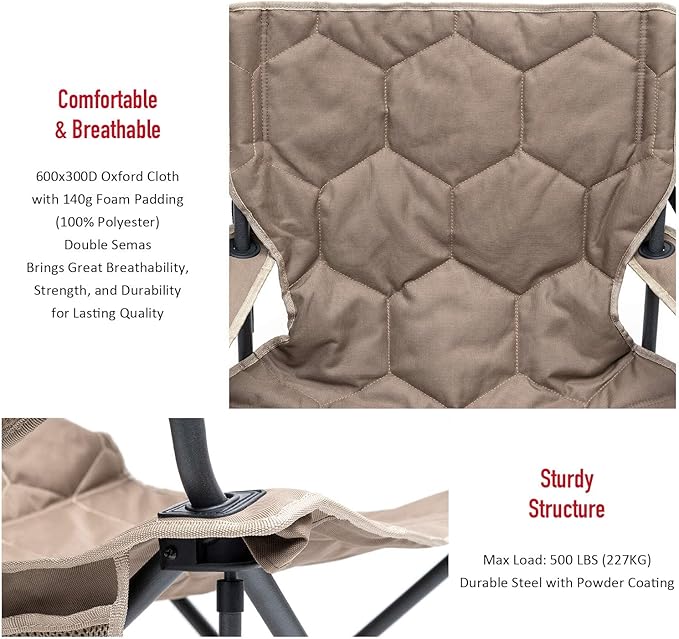 - Oversized & Maximum Weight Capacity: The oversized folding chair size is 25"x38"x38" and the sturdy steel frame construction affords up to 300 LBS (136KG) weight capacity. This oversized & padded chair is your best partner to help you to relax and enjoy your journey.