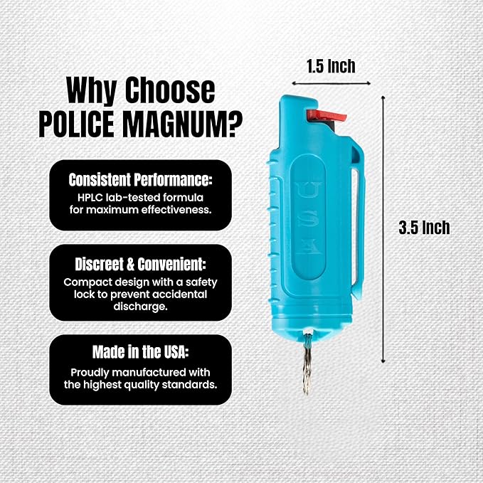- Proudly made in the USA - 1.33% MC police pepper spray maximum heat strength OC that is used and trusted by several law enforcement agencies and security personnel - Our formula is HPLC lab tested for a consistent self defense pepper spray performance. Provides strong 10-12ft range with multiple blasts.