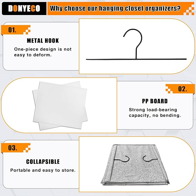 - 【Sturdy and durable】2 sturdy rods and 2 durable metal hooks, with 7 PP panels in the compartment for firm support.