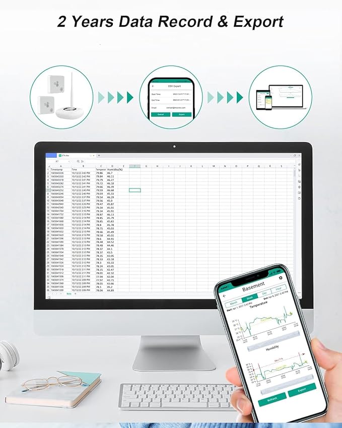- 2-Year Data Storage and Export: The smart temperature sensor on MOCREO APP provides clear charts for tracking temperature/humidity trends over time. You can enjoy 2 years of free data storage and CSV table support for detailed analysis