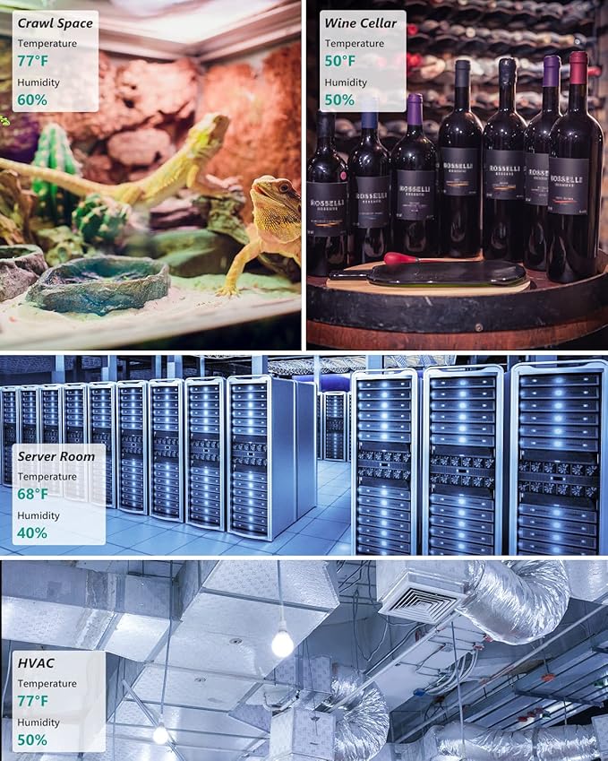 - Accurate Monitoring: The temperature and humidity monitor built-in SHT30-DIS-B chip for precise data, accuracy of ±0.54°F and ±3% RH. Temp range -4°F~140°F, humidity range 0~100% RH. Ideal for greenhouse, vacation house, warehouse, basement, etc