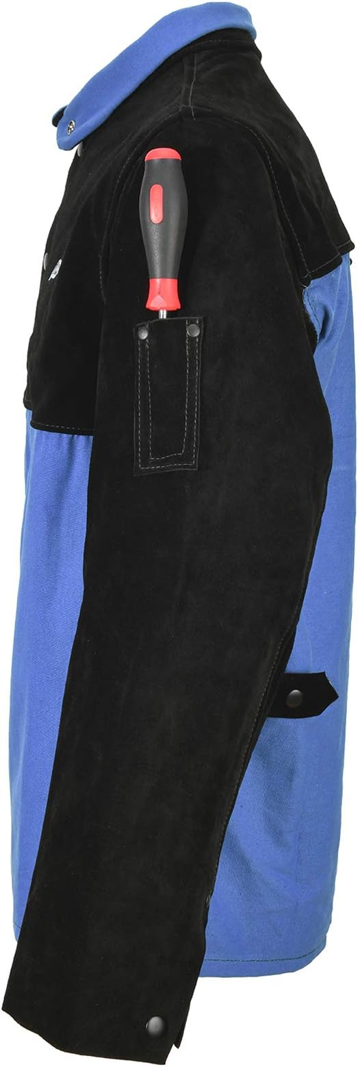 - EXTRA LEATHER PROTECTION - Our jacket is made from leather and cotton. Split cowhide leather is incorporated on the arms sleeves, shoulders and chest which are high impact and key protection areas from heat and spatter