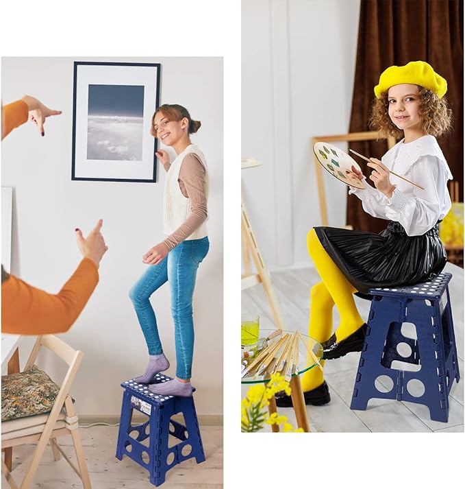- Anti Slip : Rubber grips on the surface and anti-slip rubber feet on each foot create maximum grip, has amazing support and comfort. Unique grip-dot textured surface makes the folding step stool safe for everyone, including kids. These safety features make the step stool great for multipurpose uses i.e. kitchen, bathroom, dining room, office, garden, camping, fishing, and more