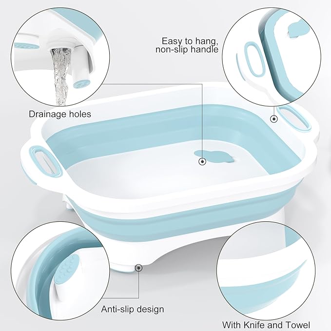 - 【2 in 1 Cutting Board】Collapsible camping sink for washing vegetables, dishes, fruits. Foldable cutting boards for cutting, chopping and slicing, also used as a storage basket for storing various foods and drinks, which effectively save your money, time and space.