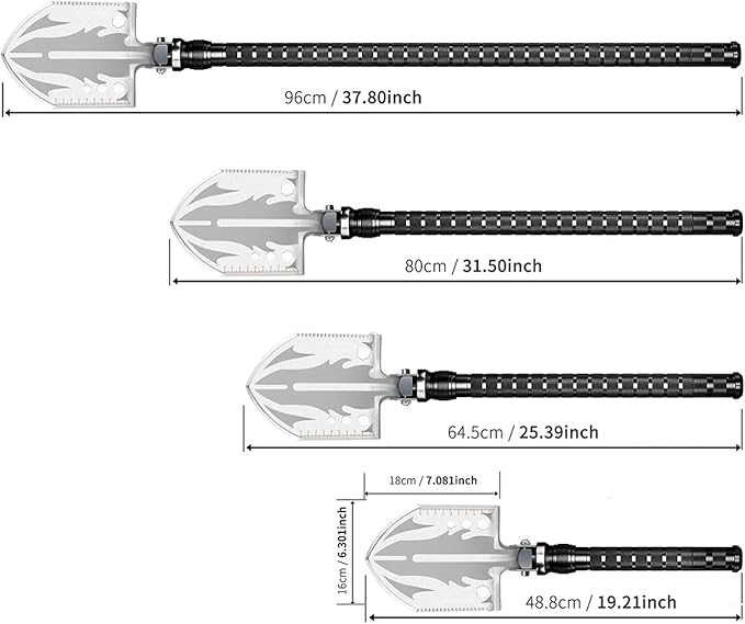 - 【All-in-one Multipurpose Survival Tool Kit】Sunkoon folding camping survival shovel Axe Set includes shovel, axe, cutter, saw, hoe, hook, stick, wrench, batch screwdriver, bottle opener, hunting spear , whistle, fire starter, ice piton, window breaker, scraping fish scales and compass. Etc .Perfect for shoveling, chopping, cutting, sawing, digging, hammering, bottle opening. Ideal for camping, hiking, off-roading, SUVing, backpacking, fishing, hunting , gardening, ready for you anytime, anywhere