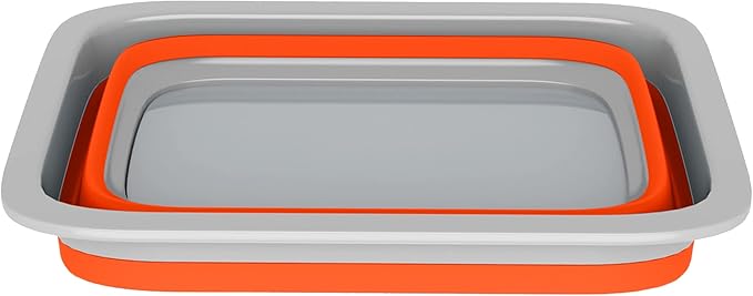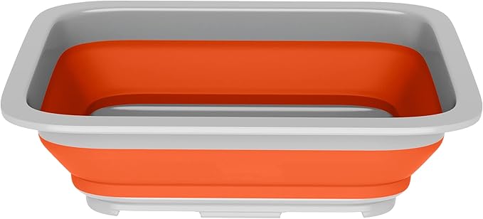 - PRODUCT DETAILS - Materials: Plastic and Plastic Rubber. Dimensions: (L) 14.75" x (W) 10.75" x (H) 5"; Collapsed: (H) 2". Maximum Capacity: 7.27-Liters. Color: Orange.