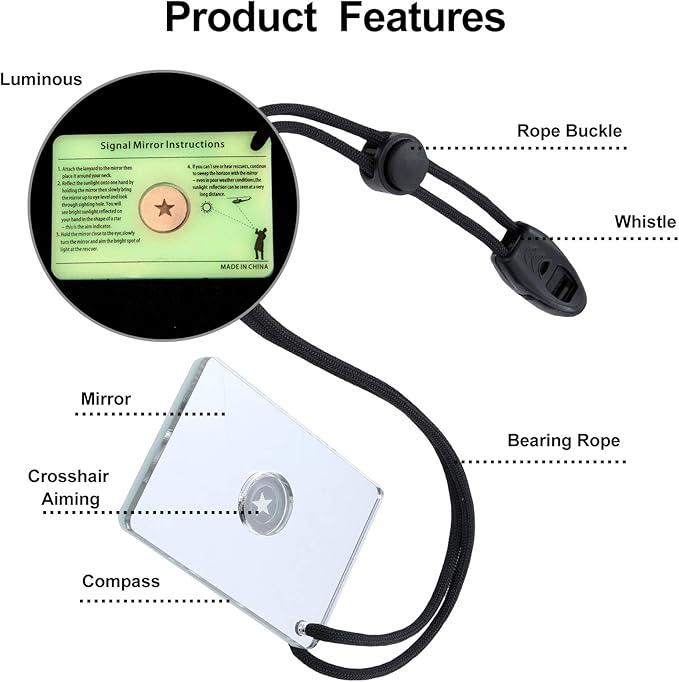 - Multifunctional and practical: the small signal mirrors adopt built-in precision aiming system, which is great for outdoor survival activities, long-distance communication in the field, sending reflective survival mirror signal, etc.; With accurate and fast signal transmission, the light signal transmission distance can reach several kilometers on a clear day; The mirrors can be applied normally on cloudy days or at night when there is light, and can also be applied as mirrors at ordinary times