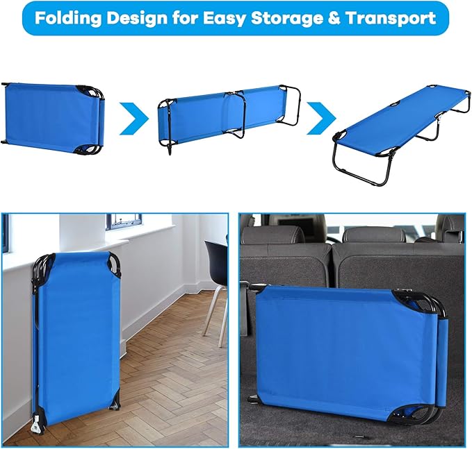 - Folding Camping Cot: This camping cot is foldable, you can put it in the trunk of your car and take it anywhere. You can take it to the garden, park, forest, the beach, or other places you want to go. It's also a great sleeping cot to be used in patio and balcony. You can also put it in your office or bedroom as a nap bed or an extra bed for friends.