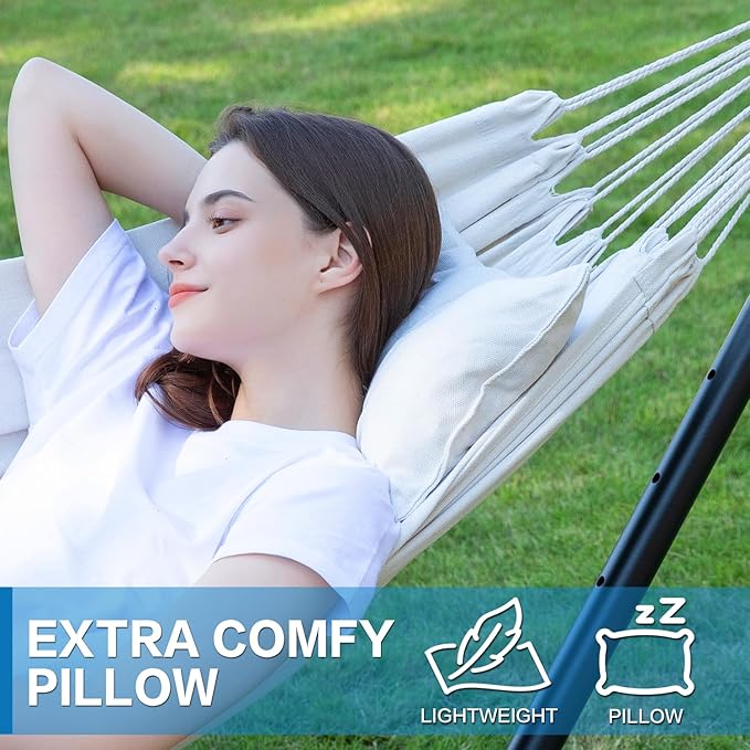 PNAEUT Double Hammocks with Stand for Outside, Portable Space Saving Heavy-Duty Steel Stand for Indoor Outdoor Patio with Carrying Bag, 450 lbs Capacity (Beige)