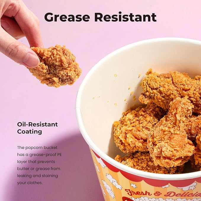 - Grease & Leak Proof - Our paper buckets are lined with a grease-proof coating on the inside, which effectively prevents grease from leaking through. Popcorn containers disposable are perfect for serving hot food without the worry of butter getting on your fingers, clothes, or pants.