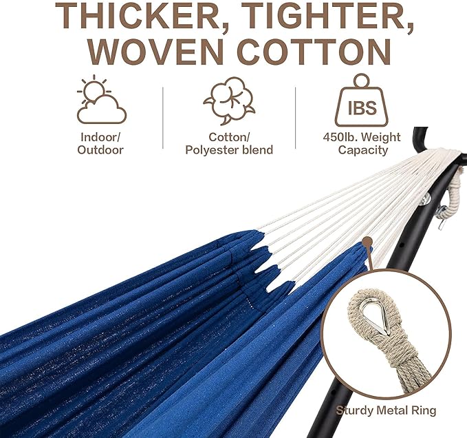 PNAEUT Double Hammocks with Stand for Outside, Portable Space Saving Heavy-Duty Steel Stand for Indoor Outdoor Patio with Carrying Bag, 450 lbs Capacity (Navy)